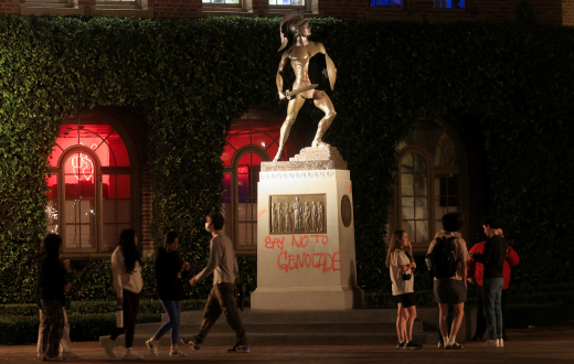 شعار تفاجأ مسؤولو جامعة جنوب كاليفورنيا بوجوده على تمثال تومي طروادة والنافورة في حديقة الخريجين، فاتهموا المشاركين بمخيمات التضامن بأنهم “الجناة” واعتبرت الحدث بمثابة “تخريب غير مقبول ولن يتم التسامح معه"، ومنعت الدخول لغير طلاب السكن الجامعي بسبب المظاهرات الطلابية المؤيدة للفلسطينيين.