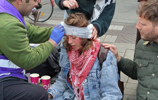 الناشطة الخطيب، أبدت استهزاءها بما أسمته “المجتمعات المتحضرة” وذلك تعليقًا على صورة لإحدى الطالبات المتضامنات مع فلسطين ضد الإبادة الجماعية، أصيبت في رأسها خلال فض الشرطة الهولندية لمخيم تضامني في جامعة أمستردام.