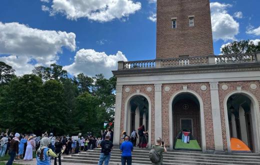 نظم عدد من الطلاب مظاهرة داخل الحرم الجامعي وصولًا إلى مبنى “مورهيد باترسون” الذي تقام في باحته احتفالات التخرج السنوية، وقاموا بتلطيخ واجهاته باللون الأحمر احتجاجًا على جرائم الإبادة الجامعية المتواصلة في قطاع غزة، كما أقام الطلاب معسكرًا عند برج الجرس الشهير حيث سيرغب العديد من الخريجين في التقاط صور تخرجهم.