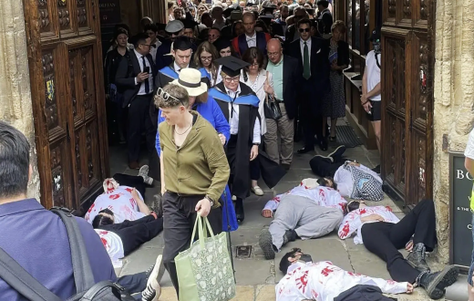 شارك أكثر من خمسين طالبًا من طلاب جامعة أكسفورد في تنفيذ “مظاهرة الموت” على البوابات المؤدية إلى مكان انعقاد حفل التخرج الذي شهدته الجامعة أمس الأحد، تنديدًا بجرائم الإبادة المتواصلة في قطاع غزة.