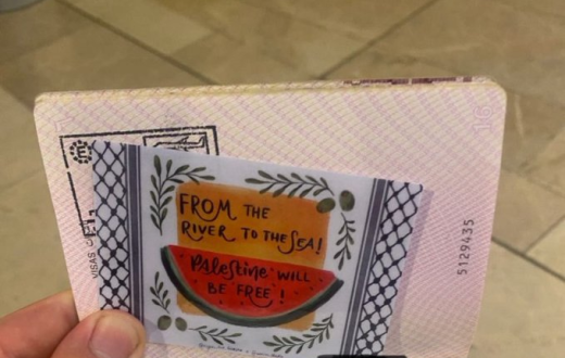 بعد أن وصل مواطن فلسطيني مطار مدريد، تفاجأ بعد أن ختمت الشرطة الإسبانية جواز سفره ودخل البلاد بوجود بطاقة داخله، مكتوب عليها :"من النهر إلى البحر، فلسطين ستكون حرة".