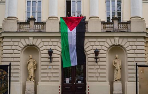 اعتلى عدد من طلاب جامعة وارسو البولندية أحد مباني الجامعة، ورفعوا علمًا فلسطينيًا ضخمًا على واجهته الرئيسية، ضمن حراكهم الهادف لإجبار إدارة الجامعة على قطع كافة العلاقات الأكاديمية مع كيان الاحتلال.