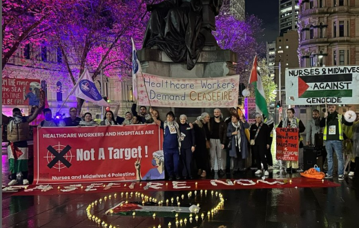 اجتمع عاملو الصحة من ممرضات وقابلات وإداريين من أجل فلسطين الليلة الماضية في سيدني الأسترالية، حدادًا على 514 من العاملين في مجال الرعاية الصحية الذين قتلتهم “إسرائيل”، وللاحتجاج على الظلم الذي يعيشه الفلسطينيون في غزة وللتنديد بتواطؤ الحكومة الأسترالية وكل من يلتزم الصمت إزاء المجازر الجارية.