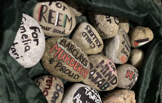 كل حجر من هذه الحجارة يحمل قصة فلسطينية لشهداء وشعارات تشكل رسالة تم إلقاءها كسلاح بوجه نحو 20 فرعًا من أفرع بنك باركليز ممول الإبادة، الذي ظل أصمًا طوال أشهر أمام تظاهرات ووقفات تنادي بوقف استثماره في الحرب الإسرائيلية على قطاع غزة.
