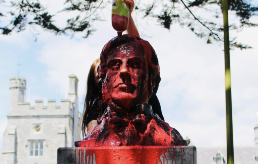 وقد رشق الطلاب غالبية معالم الجامعة بالأحمر، وأبرز هذه المعالم تمثال جورج بول الشهير خارج مكتبة الكلية كناية عن الدم الفلسطيني المسكوب في غزة بسبب آلى الإبادة الصهيونية.