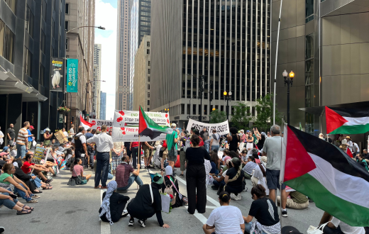 اعتقلت شرطة شيكاغو مجموعة من المتظاهرين المؤيدين للفلسطينيين بعد ظهر السبت بدعوى إغلاقهم طريق تقاطع شارع فرانكلين بين وشارع مونرو وأركيد بليس وأن المتظاهرين رفضوا مطالبات الشرطة بالتفرق.