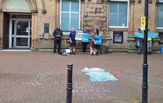 نظمت مجموعة التضامن مع فلسطين في كارلايل وديستريكت البريطانيتين احتجاجها لتسليط الضوء على تورط البنوك مالياً مع شركات تزود "إسرائيل" بالأسلحة والتكنولوجيا العسكرية. وكتب المحتجون أرقامًا بالطباشير خارج المبنى للفت الانتباه إلى الضحايا بين المدنيين في غزة بفعل الحرب الإسرائيلية.