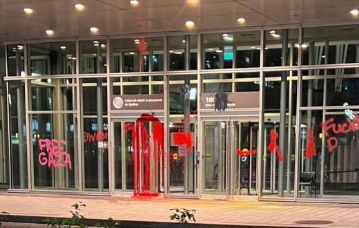تظاهر مؤيدون لفلسطين ضد صندوق الإيداع الكندي في كيبيك الذي يمثل معاشات ستة ملايين من السكان (ثاني أكبر صندوق ادخار عام في كندا)، احتجاجًا على استثماراته في الشركات التي تصنع الأسلحة التي تستخدم حاليًا في شن الإبادة الجماعية ضد الفلسطينيين.