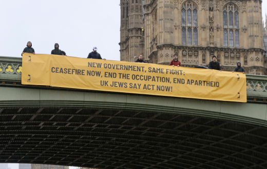أسدل نشطاء مؤيدون لفلسطين لافتة على جسر ويستمنستر فيها دعوة للحكومة البريطانية الجديدة بتغيير مسار تعاملها مع القضية الفلسطينية وعدم إعطاء غطاء للاحتلال لمواصلة حرب الإبادة في غزة، مؤكدين مواصلتهم العمل لأجل فلسطين تحت شعارات “وقف إطلاق نار الآن”، و”أوقفوا الإبادة”، و”أنهوا الاحتلال والفصل العنصري”.