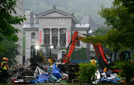 وتحت الأمطار الغزيرة، حمل المتظاهرون المؤيدون للفلسطينيين أمتعتهم خارج الحرم الجامعي، في حين قامت الجرافات وقوات الأمن بتفكيك المخيم؛ وقالت وزيرة التعليم العالي باسكال ديري إن "الوقت قد حان لإخراج المتظاهرين من المخيم".