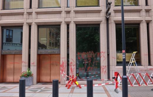 استهدف نُشطاء من "حركة فلسطين " بنك "نورجيس" في النرويج لتواطئه مع كيان الاحتلال في إبادته للشعب الفلسطيني بغزة، حيث قاموا بتلطيخ واجهات البنك بالطلاء الأحمر وخط شعارات مناهضة للإبادة، وحذروا البنك من استمراره بتمويل الاحتلال.