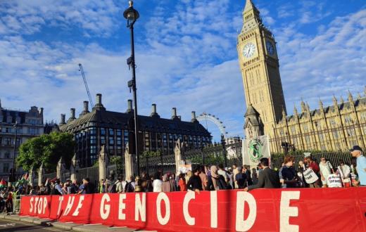 يشبك آلاف المؤيدين لفلسطين أيديهم حول البرلمان كدعوة موحدة لوقف فوري لإطلاق النار في غزة ولإرسال رسالة قوية إلى حكومة كير ستارمر الجديدة لوقف تسليح كيان الاحتلال.