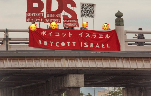 "قاطعوا إسرائيل".. رفع يابانيون لافته كبيرة على جسر شيجو وهو أكثر المعالم شهرة في مدينة كيتو اليابانية، وذلك رفضًا لاستمرار الإبادة الجماعية في قطاع غزة ولإظهار الدعم للشعب الفلسطيني.