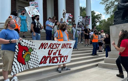 تجمع العديد من طلاب جامعة لويزفيل الأمريكية في الحرم الجامعي في اليوم الأول من الفصل الدراسي الخريفي 2024 للتظاهر وإظهار دعمهم لفلسطين، قال سيد بيكر من طلاب لويزفيل من أجل العدالة في فلسطين: "أنا هنا للدفاع عن الفلسطينيين الذين ماتوا على أيدي الصهيونيين".