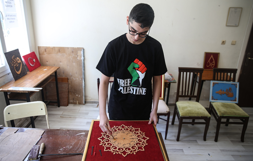 تبرع الطالب التركي علي بوزقورت، الذي يدرس في الصف الحادي عشر بمدرسة الأئمة والخطباء في ولاية مرسين، بعائدات لوحاته المنحوتة على الخشب لدعم سكان غزة.