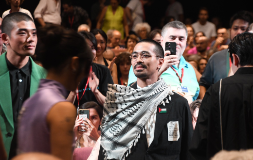 حرص المخرج الياباني “نيو سورا” خلال العرض الأولي للفيلم الياباني Happyend على دعم غزة من خلال ارتدائه الكوفية والعلم الفلسطيني في مهرجان البندقية السينمائي.