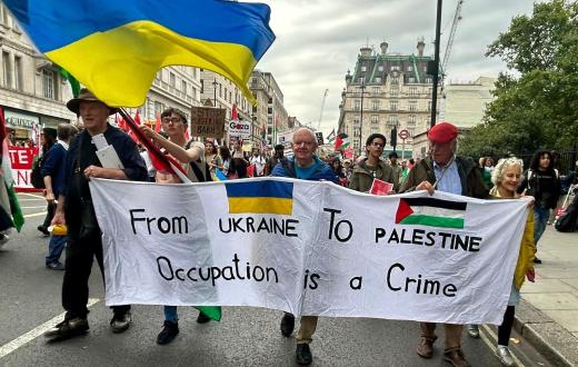 خلال تظاهرة تضامنية مع فلسطين في لندن، رفع المتظاهرون لافتة كتب عليها "من أوكرانيا إلى فلسطين، الاحتلال جريمة"، حيث مقارنة بتعرض فلسطين لعمليات إبادة جماعية من قبل “إسرائيل”، بينما تسعى روسيا لضم أوكرانيا في حرب بدأت منذ 24 فبراير 2022.