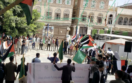 نظمت جامعة الرازي ومنتدى الطلاب الجامعيين في صنعاء وقفة تضامنية مع الشعب الفلسطيني تحت شعار "مولد نبي الهدى نداء لنصرة غزة والأقصى ونداء إنساني لكل طلاب العالم".