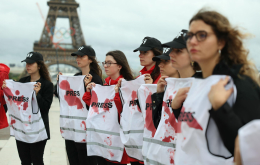 في فعالية نظمتها منظمة “مراسلون بلا حدود” في جميع أنحاء فرنسا، حمل الأعضاء سترات صحفية ملطخة بدماء مزيفة لدعم الصحفيين العاملين في قطاع غزة وتكريمًا لأولئك الذين فقدوا حياتهم خلال الحرب المستمرة في غزة. وقد أقيمت الفعالية في ساحة تروكاديرو، مع برج إيفل في الخلفية، في باريس، بتاريخ 26 سبتمبر 2024. وتهدف هذه الحملة إلى تسليط الضوء على المخاطر التي يواجهها الصحفيون في مناطق النزاع وتأكيد أهمية حمايتهم أثناء تأدية واجبهم المهني.