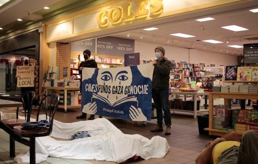 نظمت مجموعة كوموكس فالي من أجل فلسطين احتجاجًا أمام متجر كتب كورتيناي كولز في دريفتوود مول بكندا. استخدم المتظاهرون لافتات وتظاهروا بالموت احتجاجًا على تورط شركة إنديجو، الشركة الأم لكولز، في الحرب الإسرائيلية على غزة.