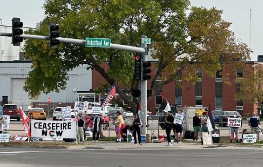 تجمع نُشطاء مؤيدون لفلسطين خارج منشأة "جنرال ديناميكس" لتصنيع الأسلحة في شمال لينكولن، حاملين لافتات تدعم القضية الفلسطينية، وهتفوا بهتافات منددة بتعاون المصنع مع الولايات المتحدة والاحتلال الإسرائيلي.