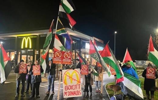 احتشد أنصار فلسطين أمام أحد فروع “ماكدونالدز” في مدينة ميد أولستر بأيرلندا، احتجاجًا على استمرار تواطؤ الشركة في حرب الإبادة بقطاع غزة. وطالب المحتجون بإغلاق الفرع، مؤكدين أن أرباحه تُساهم في قتل الفلسطينيين. ورفعوا لافتات مناهضة للاحتلال والعلامة التجارية المتواطئة، كُتب عليها “قاطعوا ماكدونالدز”، إلى جانب الأعلام الفلسطينية.