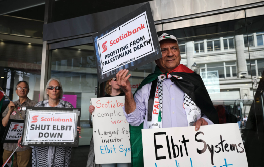 احتج أنصار فلسطين في ميشيغان ضد تورط "سكوتيا بنك" في الإبادة الجماعية الإسرائيلية عبر استثماره في مصنع الأسلحة الإسرائيلي "إلبيت سيستمز". رفع المحتجون أعلام فلسطين وحملوا لافتات كتب عليها: “سكوتيا بنك يستفيد من موت الفلسطينيين” و”أغلقوا إلبيت”.