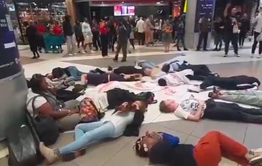 نظم مؤيدون لفلسطين وقفة احتجاجية أمام مطعم "ماكدونالدز" في مركز تسوق ساندتون سيتي بجنوب أفريقيا، احتجاجًا على تواطؤ سلسلة المطاعم في الإبادة الجماعية الإسرائيلية المستمرة في قطاع غزة، ونظم المحتجون خلال الوقفة فعالية "موت رمزي" للفت الأنظار حول الشهداء بغزة، وحملوا أعلام فلسطين ورددوا شعارات مناهضة للاحتلال.