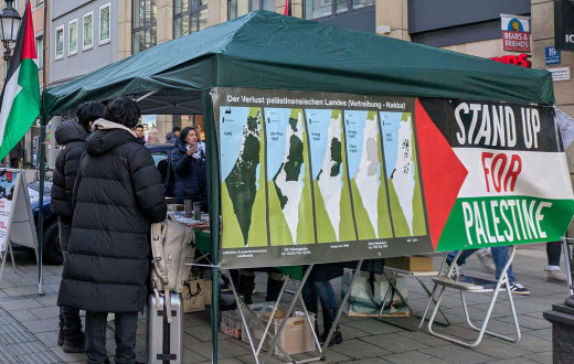 أقام نشطاء كشكًا توعويًا لدعم القضية الفلسطينية في شارع مزدحم بمدينة ميونخ بألمانيا، تضمن منشورات توضح ما يحدث في فلسطين ولافتات كتب عليها "قف من أجل فلسطين"، وسلسلة من الخرائط التي تصور احتلال الأرض الفلسطينية.