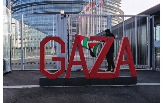 استبدل ناشطون داعمون لفلسطين كلمة "أوروبا" بكلمة "غزة" في مجسم كبير أمام البرلمان الأوروبي في ستراسبورغ، احتجاجًا على دعم الدول الأوروبية للعدوان الإسرائيلي على غزة المستمر منذ أكثر من 15 شهرًا.