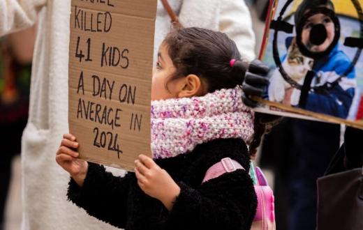 طفلة ترفع لافتة كُتب عليها "إسرائيل قتلت 41 طفلًا يوميًا في المتوسط ​​في عام 2024"، خلال مظاهرة احتجاجية بمدينة كارديف بالمملكة المتحدة، تنديدًا باستمرار حرب الإبادة ضد الفلسطينيين بقطاع غزة.