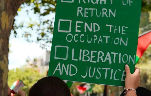 رفعت ناشطة مؤيدة لفلسطين في مدينة ملبورن الأسترالية لافتة ضمت عدد من المطالب، وكان أولها وقف إطلاق النار وقد تم تحقيقه، لتأتي باقي المطالب المنتظرة كحق العودة للفلسطينيين وإنهاء الاحتلال، والتحرير والعدالة.