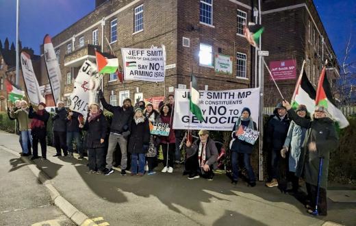 تجمع مؤيدون لفلسطين أمام مكتب السياسي من حزب العمال البريطاني، جيف سميث احتجاجًا على استمرار تقديمه الدعم لكيان الاحتلال، ورفع المتظاهرون خلال الاحتجاج لافتات تطالب بوقف تسليح الاحتلال، وإنهاء الاحتلال الإسرائيلي لفلسطين، كما حملوا أعلام فلسطين ورددوا شعارات مناهضة للاحتلال.