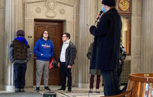 تجمع عشرات الطلاب في مبنى إدارة “هانا” بجامعة ولاية ميشيغان، دعمًا لزميلهم إيلي فولتس، الطالب في السنة الأخيرة بكلية العلاقات الاجتماعية والسياسات، والذي يواجه اتهامات تأديبية بزعم جعله رئيس الجامعة ي