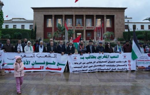 ودعا إلى الوقفة التي شارك فيها عشرات المغاربة، بالعاصمة الرباط، "مجموعة العمل الوطنية من أجل فلسطين" تحت شعار: "طوفان الأقصى.. المعركة المتواصلة ضد العدوان وضد مؤامرات التصفية". وذلك دعمًا للشعب الفلسطيني والمطالبة بالعمل على إدخال المساعدات لقطاع غزة المحاصر. وهتف المشاركون بشعارات داعمة للقضية الفلسطينية، منها: "يا مقاوم سير نحو النصر والتحرير"، "عاشت فلسطين"، و"فلسطين ليست للبيع.. لا للاحتلال، لا للتطبيع"، ورفع المحتجون لافتات كتب عليها: "لا لحرب الإبادة الجماعية" و"لا للتهجير".