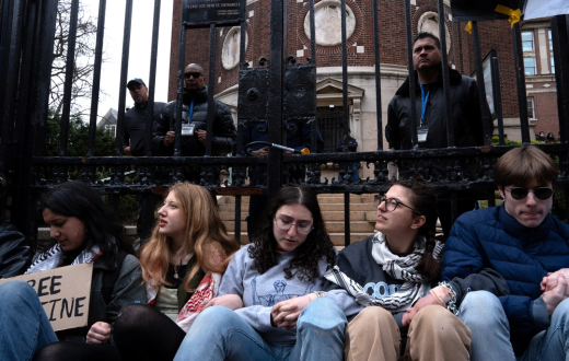 قامت مجموعة من الطلاب في جامعة كولومبيا بربط أنفسهم ببوابة الحرم الجامعي احتجاجًا على اعتقال الناشط محمود خليل، مطالبين بالإفراج الفوري عنه. وردد المتظاهرون شعارات داعمة له ورفعوا لافتات تندد باحتجازه، مؤكدين استمرار احتجاجاتهم حتى تتم الاستجابة لمطالبهم. وفيما بعد تدخلت الشرطة لفضّ احتجاج الطلاب، الذي استمر لأكثر من ساعة، وقطعت السلاسل بمنشار كهربائي وأخرجت الطلاب من الحرم الجامعي.