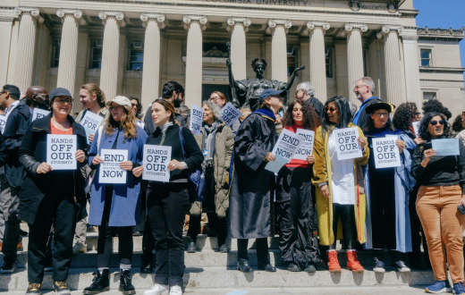 في إطار "يوم العمل" الذي ينظمه اتحاد الطلاب بدعم من عدة منظمات جامعية، تجمع حوالي 100 متظاهر في ساحة "سانديال" في جامعة "كولومبيا "، في مسيرة بعنوان "ارفعوا أيديكم" بمناسبة الذكرى السنوية الأولى لإقامة مخيم التضامن مع غزة. وقد جاءت المسيرة احتجاجًا على احتجاز الطلاب الفلسطينيين، حيث تم اعتقال الناشطين محسن مهداوي ومحمود خليل من قبل إدارة الهجرة والجمارك.