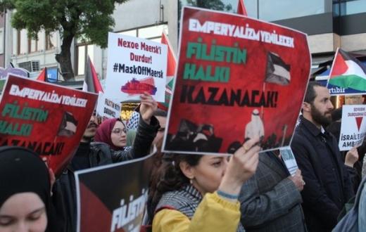 نظّمت لجنة العمل من أجل فلسطين وقفة احتجاجية أمام هيئة موانئ إسطنبول، مطالبة بمنع رسوّ سفينة "نيكسو ميرسك" في ميناء مرسين يوم 28 أبريل، وهي السفينة التي تحمل أجزاءً من طائرات إف-35 في طريقها إلى الاحتلال، في خضمّ عدوانها المستمر على الشعب الفلسطيني. واعتبر المحتجون أن السماح بمرور السفينة بمثابة تواطؤ مباشر مع الإبادة الجارية، مؤكدين أن الجهات التي تسهّل مرورها ستكون شريكة في الجريمة ويجب التحقيق معها ومحاسبتها.