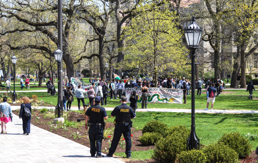 تجمع حوالي 60 متظاهرًا في الساحة الرئيسية لجامعة "شيكاغو" لإحياء الذكرى السنوية لمخيم "الجامعة الشعبية لغزة"، متحدين تهديدات العمداء المناوبين وشرطة الجامعة بشأن ما وصفته بـ “انتهاك السياسات الجديدة للاحتجاج” التي تم فرضها بعد مخيم العام الماضي.