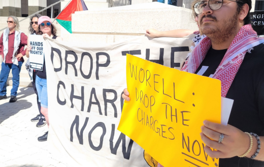 تجمّع نحو 20 متظاهرًا من أبناء المجتمع المحلي أمام محكمة مقاطعة أورانج في وسط مدينة أورلاندو، للمطالبة بإسقاط التهم الجنائية الموجهة ضد الناشط الطلابي كريس جيبسون، الطالب في جامعة سنترال فلوريدا بعد اعتقاله خلال مظاهرة مؤيدة لفلسطين في أكتوبر/تشرين الأول 2024 أمام مبنى بلدية أورلاندو.