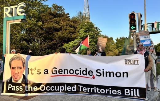نظّمت مجموعة "NoG3nocide" وقفة احتجاجية حاشدة أمام مبنى هيئة الإذاعة الوطنية الأيرلندية "RTE" بالتزامن مع ظهور رئيس الوزراء سايمون هاريس في برنامج "The Late Late Show". رفع المحتجون شعارات تندد بالعدوان على غزة، مطالبين الحكومة بتبني قانون الأراضي المحتلة، الذي يحظر استيراد منتجات المستوطنات الإسرائيلية، مؤكدين رفضهم لاستمرار التواطؤ مع جرائم الاحتلال.