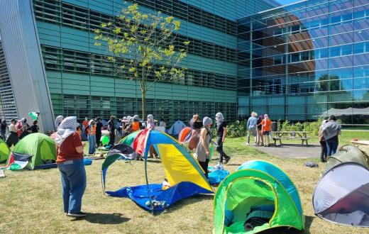في العام الماضي، خيّم الناشطون أيضًا لعدة أسابيع في حرم الجامعة. في ذلك الوقت، كان المخيم يقع على العشب بين مبنى ماريا مونتيسوري ومجمع قاعة المحاضرات. بعد احتلال شارع توماس فان أكينوسترات، أخلت الشرطة المخيم.
