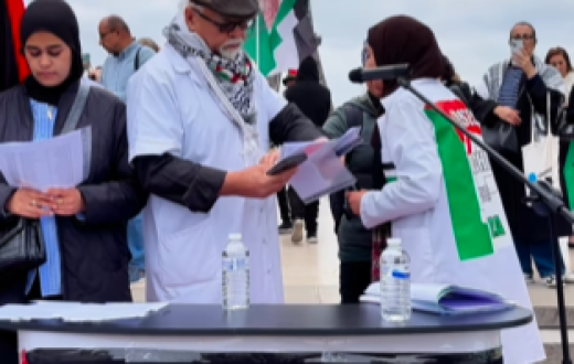 في مشهد مؤثر أمام برج “إيفيل”، ترددت أسماء شهداء الإبادة الجماعية في غزة واحدًا تلو الآخر، إحياءً للذكرى الـ77 للنكبة الفلسطينية. نظمت الفعالية مجموعة "معاطف بيضاء لغزة"، وهي شبكة من مقدمي الرعاية الصحية المتضامنين مع الشعب الفلسطيني وزملائهم في غزة، حيث ارتدى المشاركون معاطفهم البيضاء وقرأوا أسماء الشهداء.