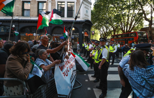 وقد واجه النشطاء الداعمين لفلسطين تضييقًا شديدًا من الشرطة البريطانية، التي أحاطت بالمكان، ومنعت المتظاهرين من التعبير السلمي عن رفضهم، وفرضت شروطًا قمعية عليهم تضمنت إنزال الأعلام واللافتات، وملاحقتهم لاحقًا بعد مغادرتهم المكان. وشجبت المجموعة هذه الإجراءات، معتبرة أنها امتداد لدور الدولة البريطانية في التواطؤ مع الاحتلال الإسرائيلي، ومحاولة لإسكات أصوات التضامن مع فلسطين.