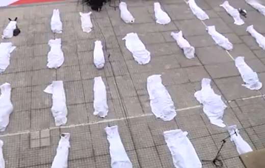 تمدد المشاركون على الأرض ملتفين بأكفان بيضاء، تعبيرًا عن التضامن مع الضحايا الفلسطينيين في ظل حرب الإبادة المستمرة التي يشنها الاحتلال.