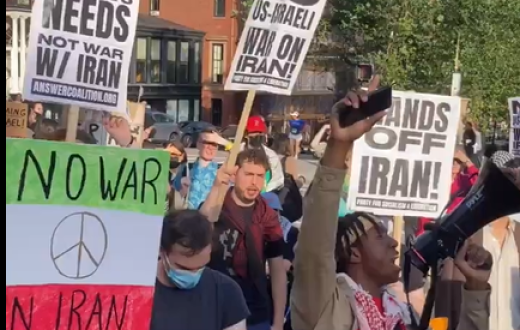 تظاهر العشرات في مدينة بوسطن بولاية ماساتشوستس، الولايات المتحدة الأمريكية، للتعبير عن رفضهم لأي عدوان عسكري أمريكي إسرائيلي ضد إيران.