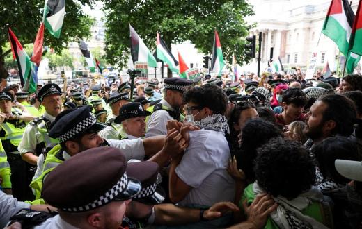 شهد ميدان “ترافلغار” وسط العاصمة البريطانية لندن، أمس الاثنين، مظاهرة حاشدة دعماً لـ "حركة فلسطين"، واجه خلالها المتظاهرون قمعت من الشرطة البريطانية.