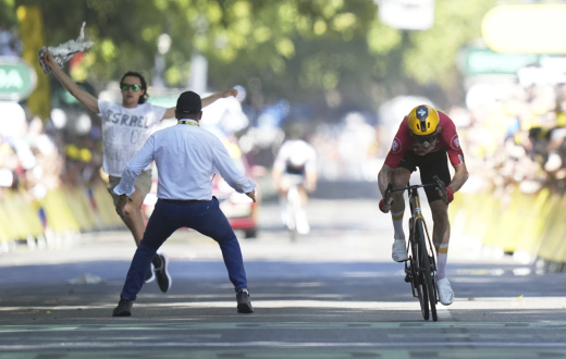 اقتحم متظاهر خط النهاية في المرحلة الحادية عشرة من طواف فرنسا للدراجات في تولوز، يوم الأربعاء، مرتديًا قميصًا كُتب عليه "إسرائيل خارج طواف فرنسا" وملفوفًا بكوفية فلسطينية، منددًا باستضافة فريق فريق "إسرائيل-بريمير تيك” فيما تستمر الإبادة في غزة.