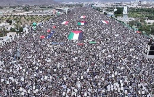 ورفع المتظاهرون أعلام فلسطين، مرددين هتافات تؤكد على مركزية القضية الفلسطينية في وجدان الشعب اليمني، الذي يحيي كل جمعة مظاهرات جماهيرية لدعم الفلسطينيين.
