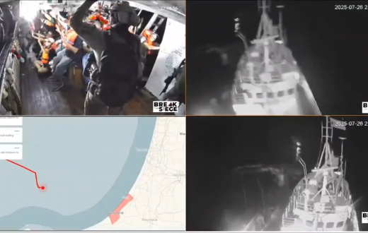 وقد اختطف جيش الاحتلال سفينة “حنظلة” أمس السبت، فيما كانت تفصلها أقل من 5 أميال عن القطاع، وذلك في بث مباشر أمام مرأى الآلاف حول العالم، حيث حذر قبلها طاقم السفينة من خطر محتمل فيما كانت تحوم حولهم السفن التابعة لجيش الاحتلال، قبل أن تقتحم السفينة وتعطل البث، ولا يزال مصير النشطاء مجهولًا حتى الآن.